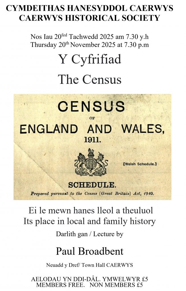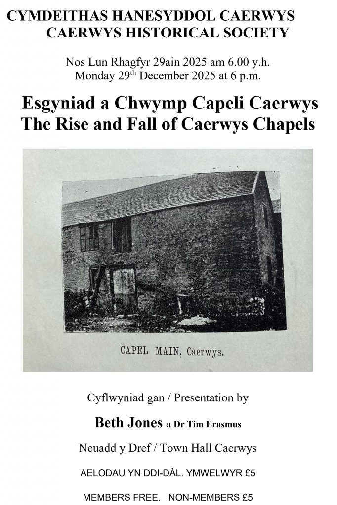 Further copies of the book, ‘Caerwys – A History Since Victorian Times’ (pictured below) are available from the Society. It will be priced at £10.00 a copy ( Plus postage cost, if required – £2.00 ).